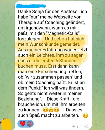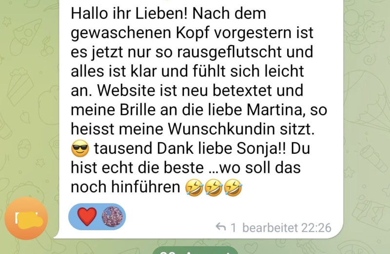 Auch wenn du mal nicht live dabei sein kannst, wirst du maximal von den Fragen der anderen profitieren, da Sonja immer auf der Metaebene erläutert, warum sie was wie macht und empfiehlt. Ungefiltert behind the scenes.