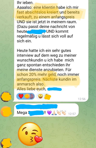 Ganz egal, ob du noch am Anfang mit deinem Business stehst und nicht gleich Vollgas mit fünfstelligem Invest in ein Businesscoaching starten willst oder schon regelmäßig Kunden gewinnst (Wenn du dein Business noch nicht so erfolgreich führst, wie du das möchtest bist du willkommen in unserem Kreis!).